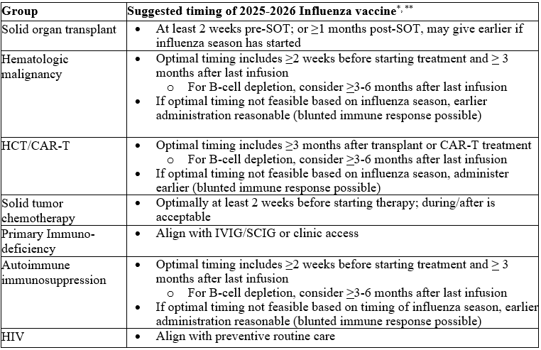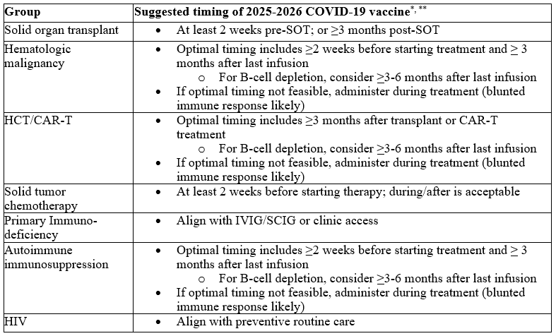 - Hematopoietic Cell Transplant (HCT)/CAR-T: Vaccination is recommended ≥3 months post-HCT/CAR-T, or ≥6 months after B-cell depleting therapy, with earlier vaccination considered during high community transmission. If vaccine is given earlier than the optimal timing, consider re-dose.