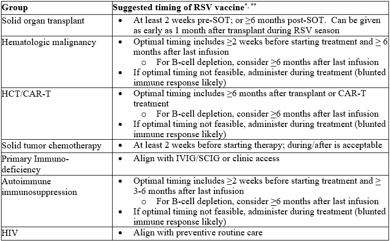 - Solid Organ Transplant (SOT): Vaccination is optimally timed ≥2 weeks pre-transplant. Ideal timing of RSV vaccination after SOT is unknown. Consider administering RSV vaccine as early as 1 month after induction/transplant during RSV season and delaying vaccination up to 6 months if outside RSV season to ensure best immunogenicity. If vaccine is given earlier than the optimal timing, consider re-dose.
