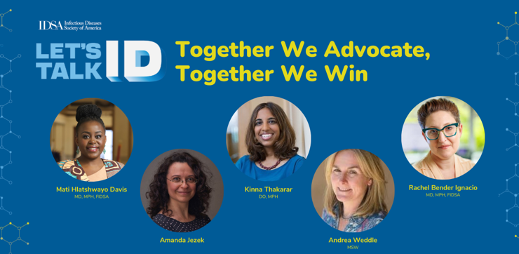IDSA Board member Mati Hlatshwayo Davis, MD, MPH, FIDSA, discusses the importance of advocacy, including how IDSA and HIVMA members can get involved, with chair and vice chair of IDSA’s advocacy captain subcommittee, Rachel Bender Ignacio, MD, MPH, FIDSA, and Kinna Thakarar, DO, MPH, FIDSA, as well as IDSA senior vice president of public policy and government relations, Amanda Jezek, and HIVMA executive director, Andrea Weddle.