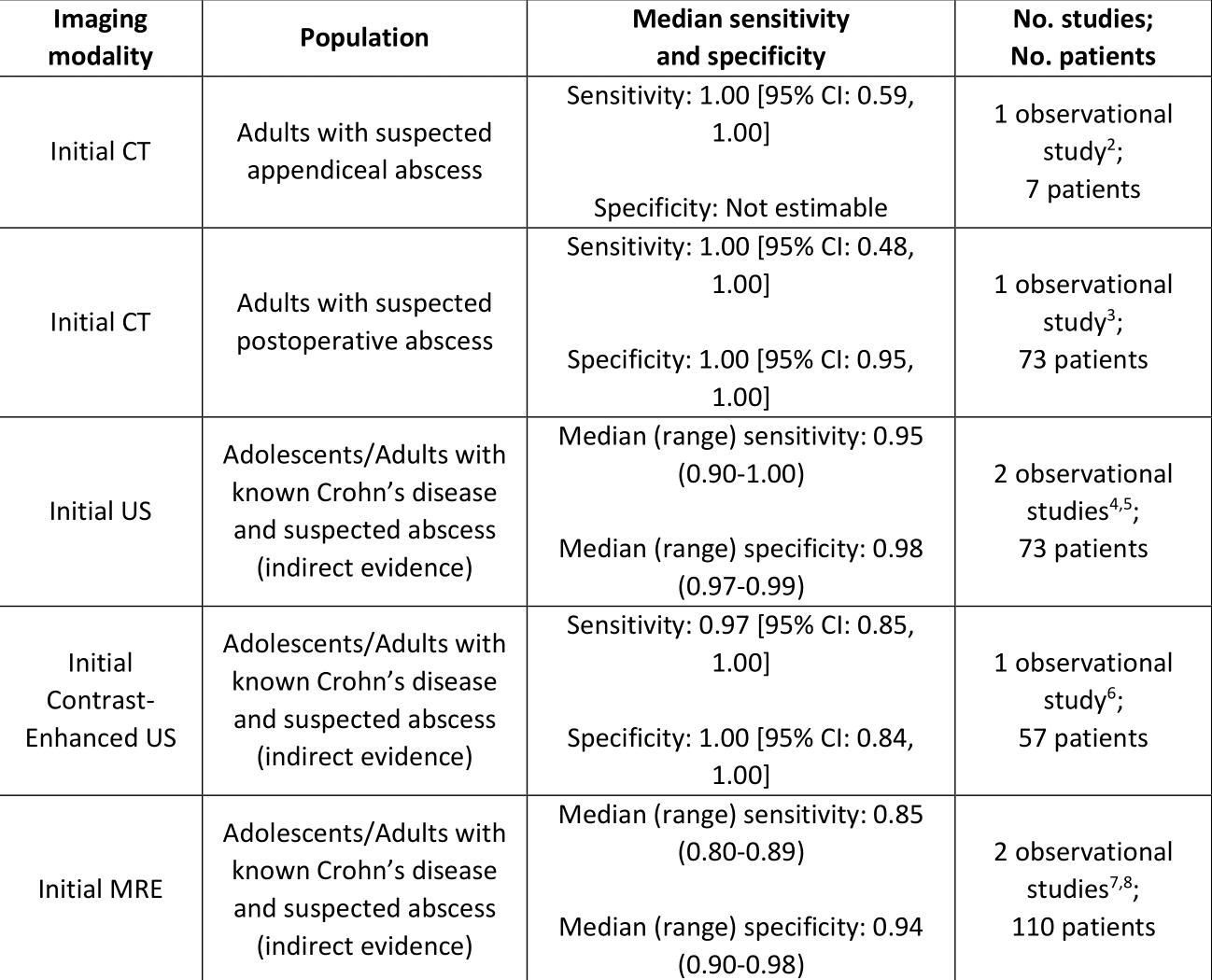 Seven observational studies2-8 were included in the analysis on whether to use CT, US, or MRI to identify acute intra-abdominal abscess in adults. Only one study2 addressed the sensitivity of CT in our patient population, i.e., patients with suspected acute intra-abdominal abscess; however, that study only included seven patients with intra-abdominal abscess. One additional study3 assessed diagnostic accuracy of CT for identifying five postsurgical intra-abdominal abscesses following bariatric surgery, and five studies were identified that addressed the diagnostic accuracy of US and MRE (magnetic resonance enterography) in adult and adolescent patients with Crohn’s disease with suspected intra-abdominal abscess.4-8