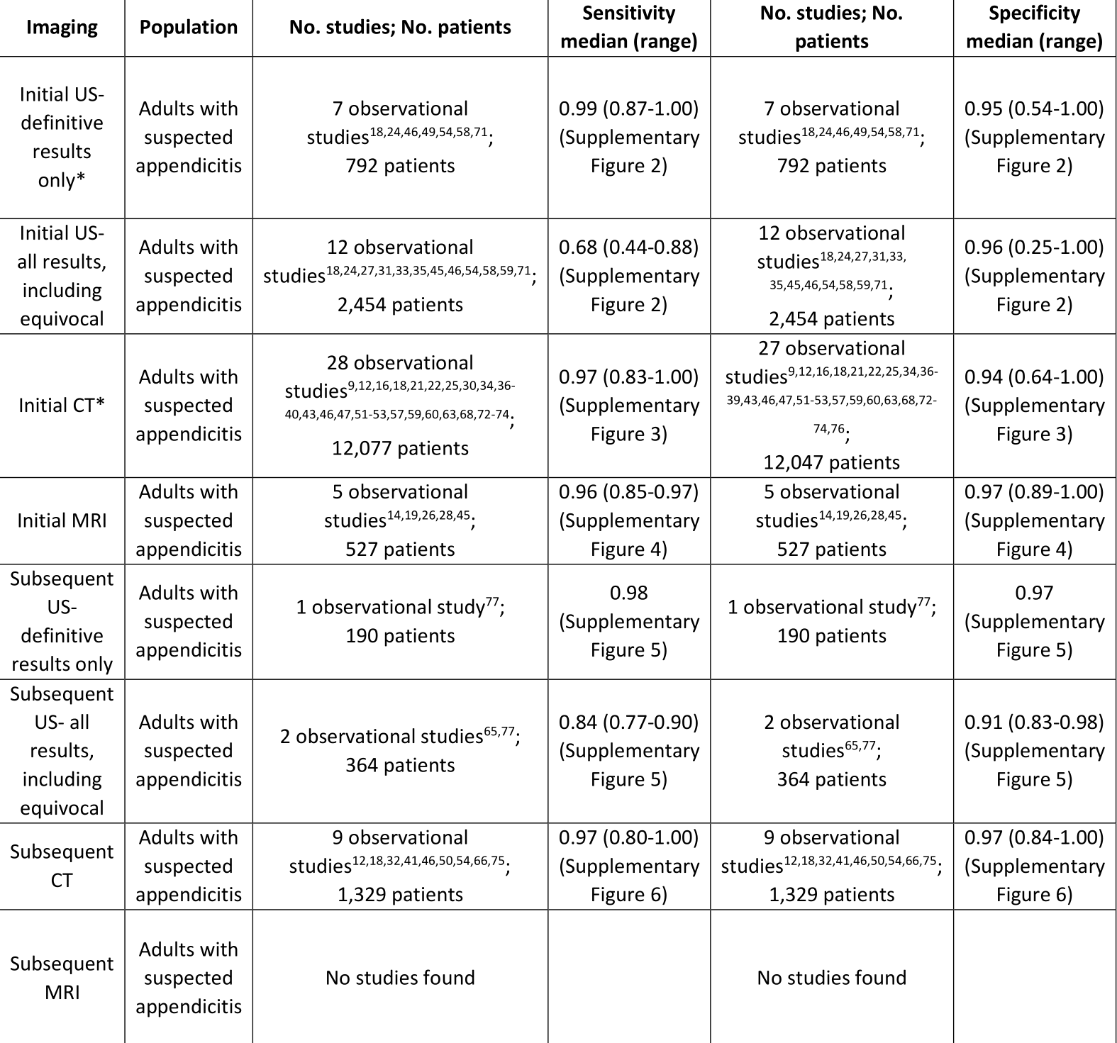 A comprehensive search and review of five selected meta-analyses2-6 yielded a total of 69 primary observational studies7-75 for the analyses on whether to use CT, US, or MRI to diagnose acute appendicitis in adults.